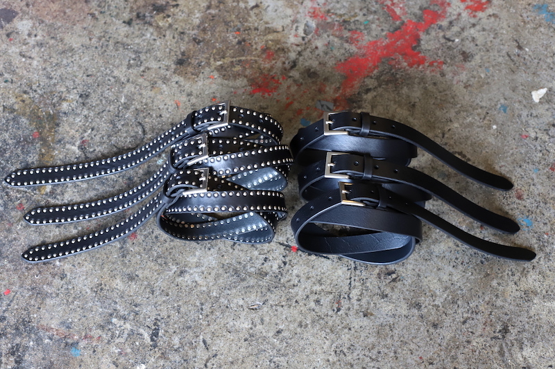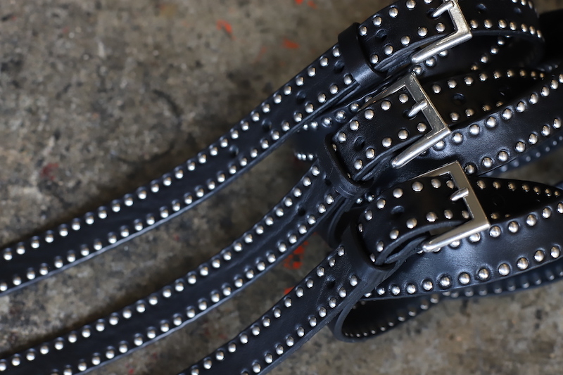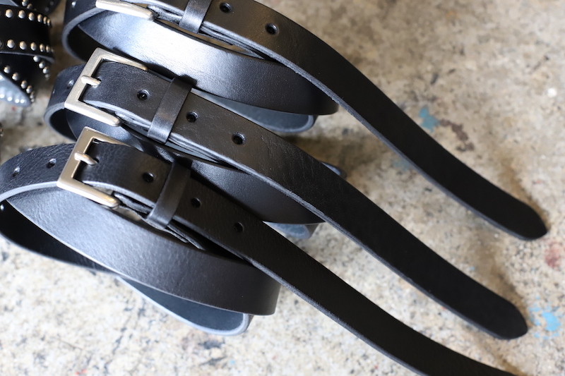 普段のベルトより細くて、普通のベルトより長めの仕様で仕上げたこちら。イタリアはトスカーナ州のタンナーが作った[ Vegitable Tanned Leather ]を使用。写真そのままですが[ プレーンでソリッドな黒 ]と[ 手打ちして頂いた職人泣かせのスタッズ仕様 ]に2パターンをご用意。