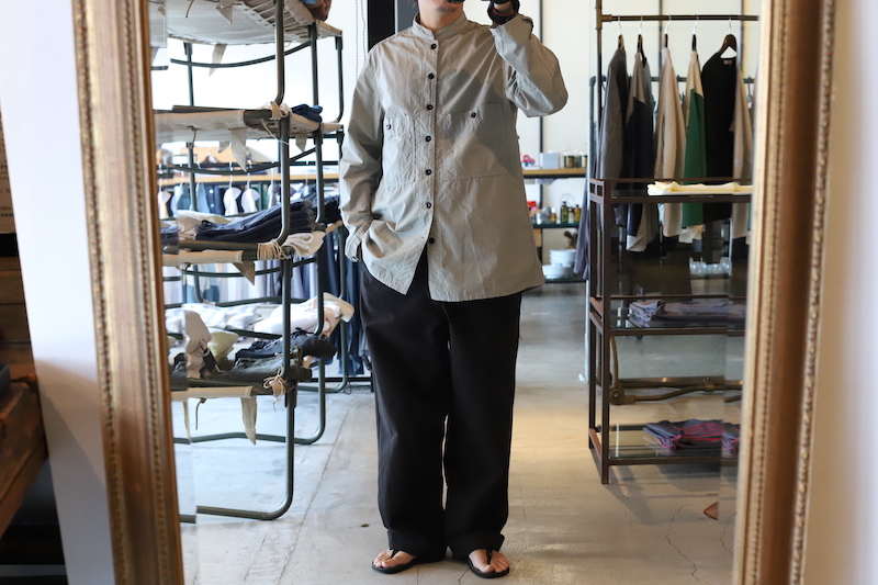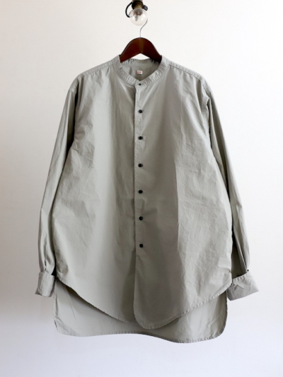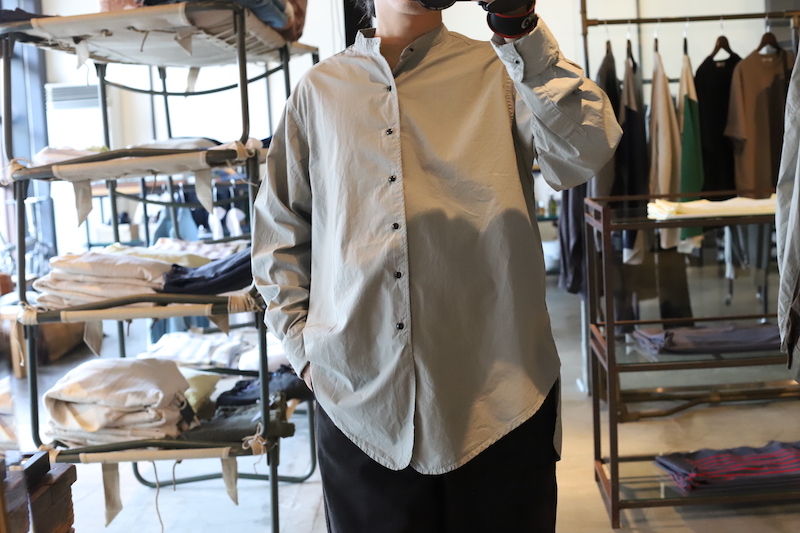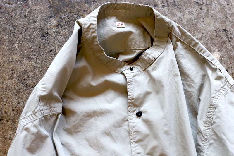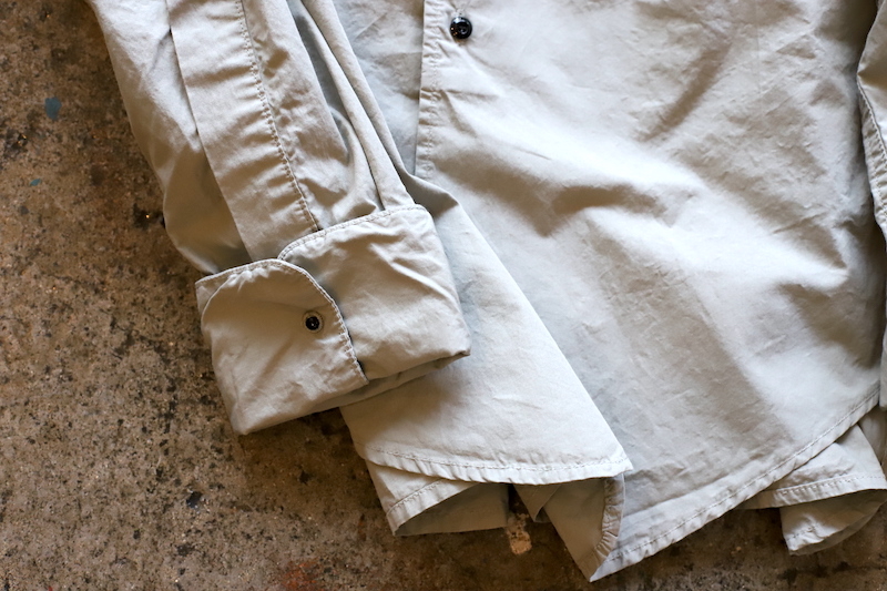 小ぶりなスタンドカラーの襟に、前見頃の裾の角度のつきかたなど、細かな点で凝っているシャツかと。首トップとダブルカフスの袖がギボシのボタンで鉄素材の黒ラッカー塗装。
