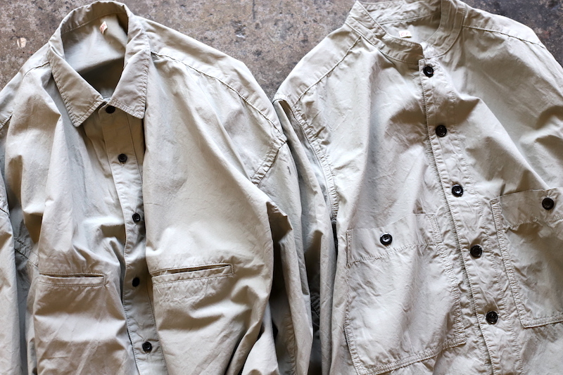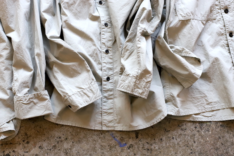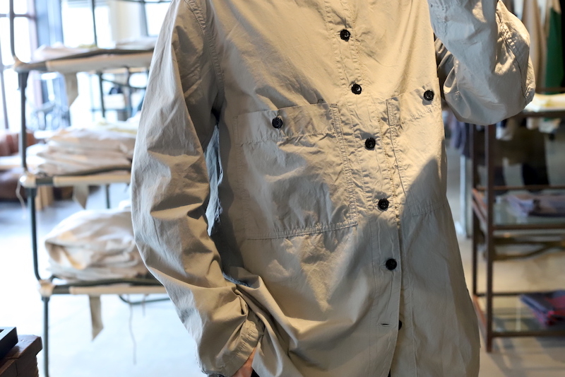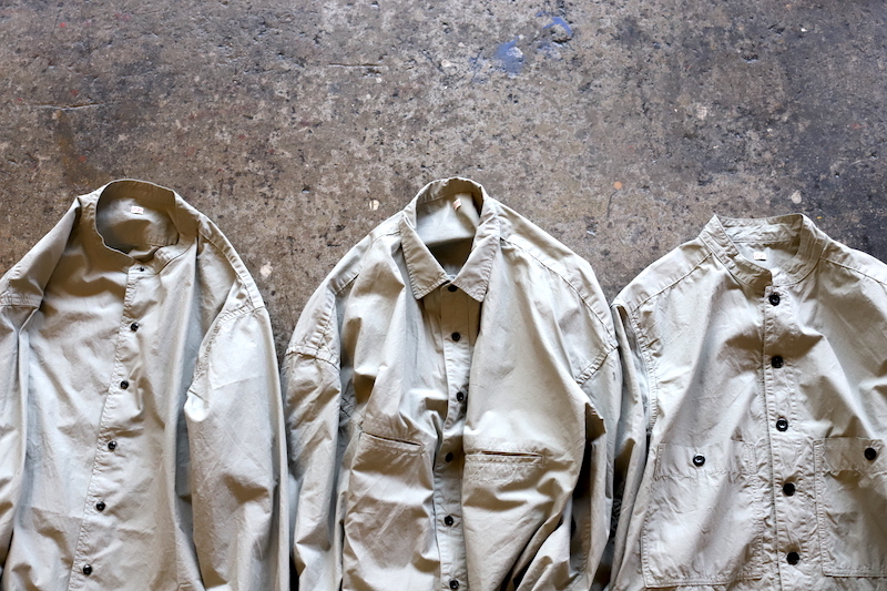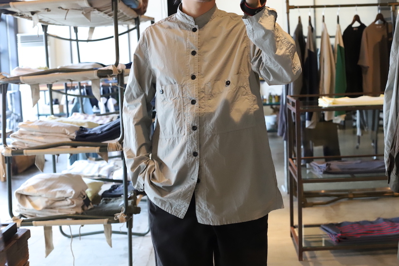OUTILの定番的な存在であるモデル。20世紀初頭の物と思われるフランス軍のブージュロンワークジャケットをベースとして、少し高めのスタンドカラーに両胸ポケット。ジャケットがベースとなっているので、シャツなんですが、フルオープンで軽く羽織っても様になるのが特徴です。