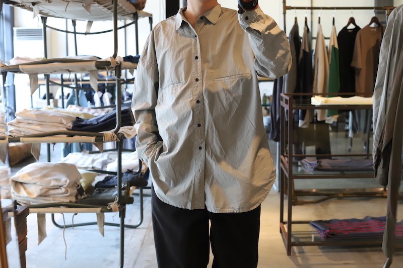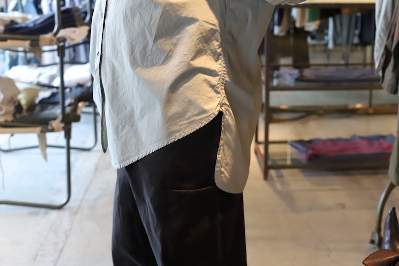 台襟がなく変形の襟の形をしていて、胸ポケットは通常よりやや低い位置に設定されている、よく見ると変わっているシャツ。襟の折り返しが緩いので、フワッと軽い印象を見せます。