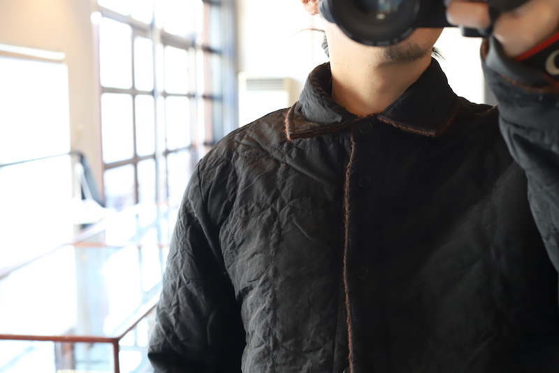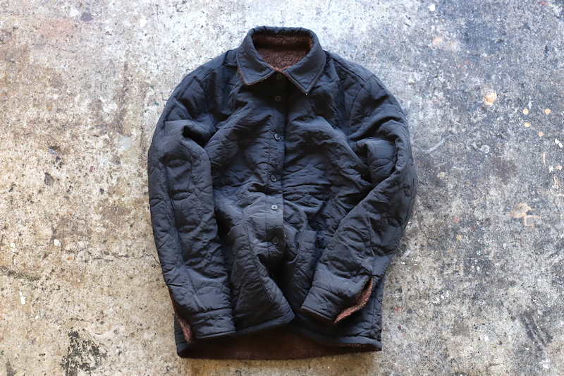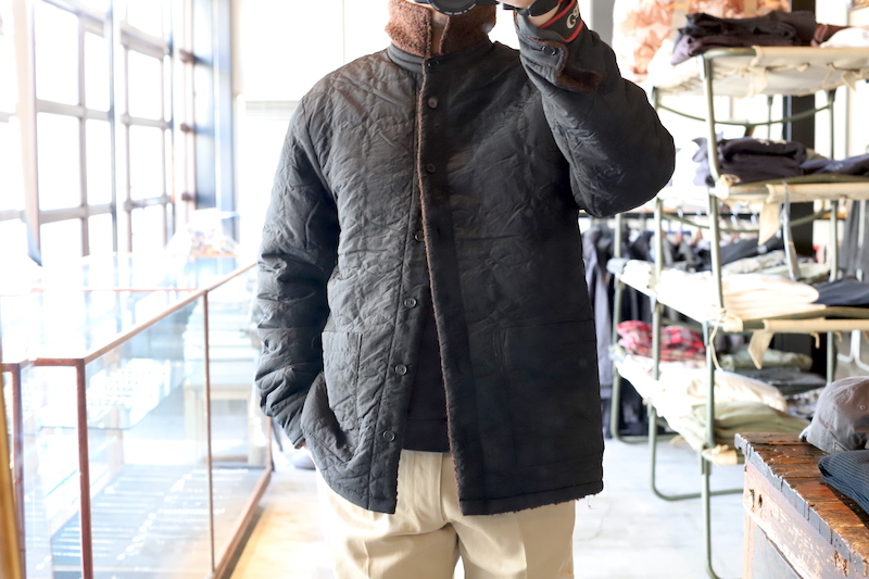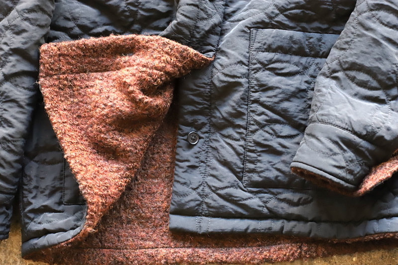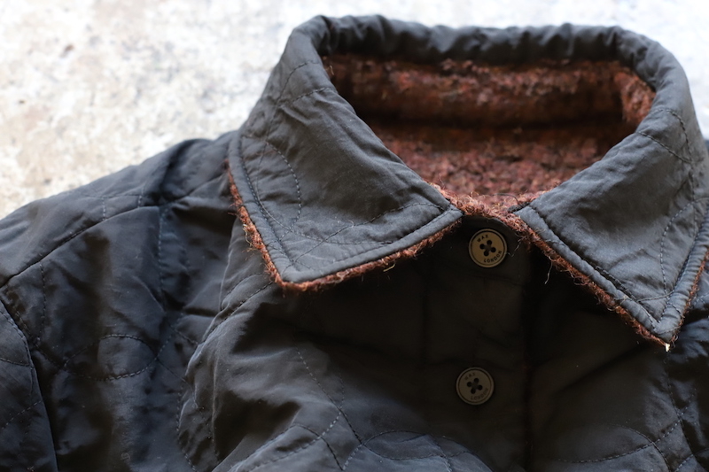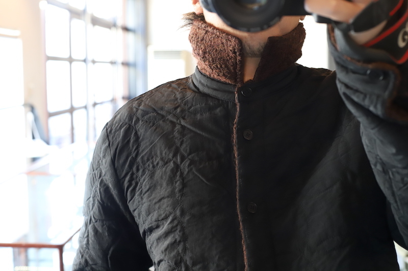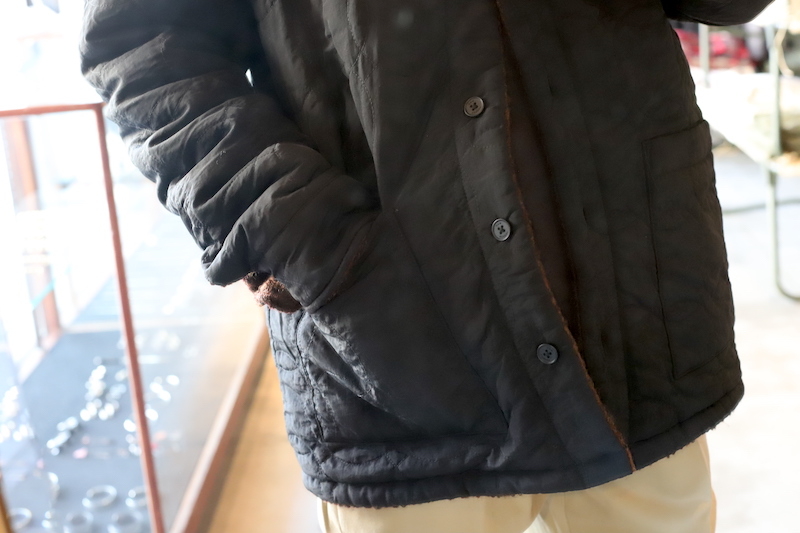 裏面は黒のキルティングに腰ポケット付き。端からハミ出る茶色の巻毛(バブルウール)がアクセントです。