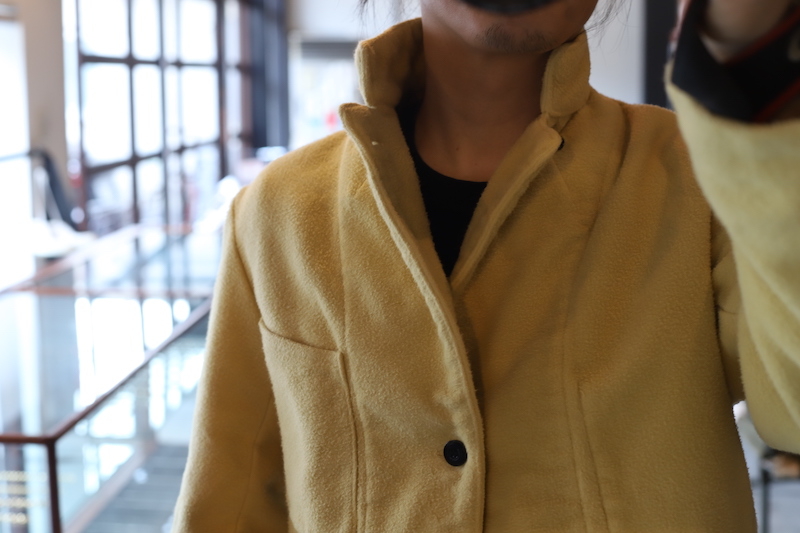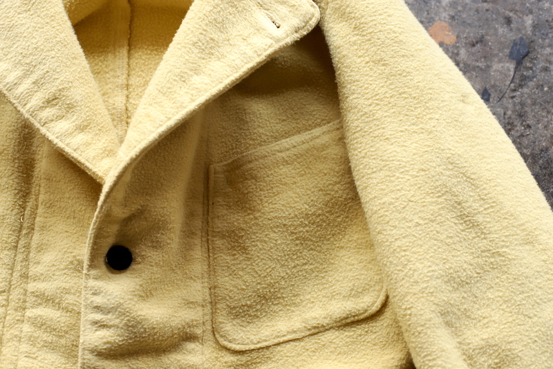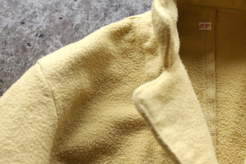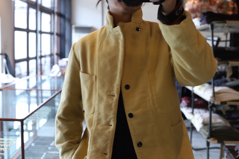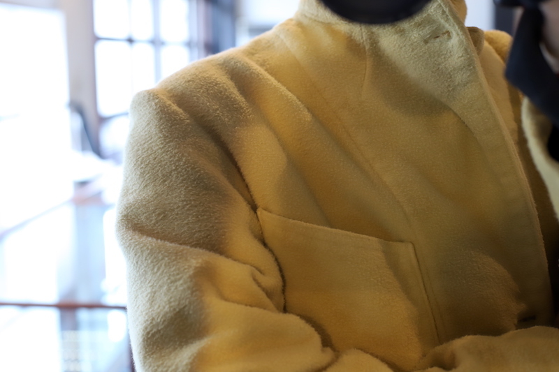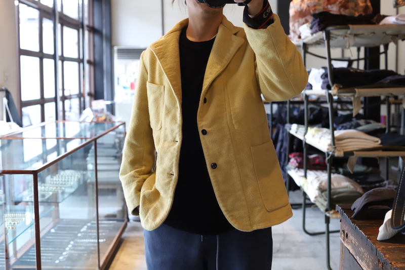 少しゆったりフィットでアームホールも太いため見た目以上に楽な着心地です。見た目がウールのような質感ですが、フカフカの毛布のような肌触り。コットン100%で製作された二重織りの生地を両面とも起毛させる事で独特の膨らみが生まれています。保温性にも富んでいるにも関わらずコットン100%でお手入れが簡単なのも重宝する点かと。そして最大の特徴であるカラー。