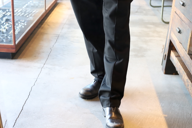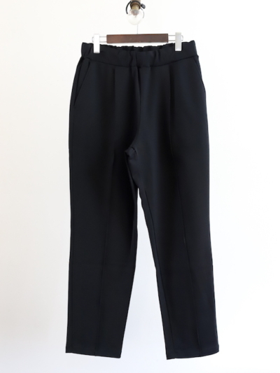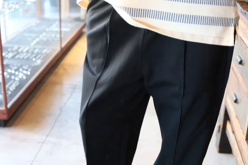 ウエストはゴムとスピンドル(腰紐)入りでカジュアルな仕上げですが、ウエストにタックが入っててセンタークリース入りと上品見えする仕様。使えるパンツになっています。