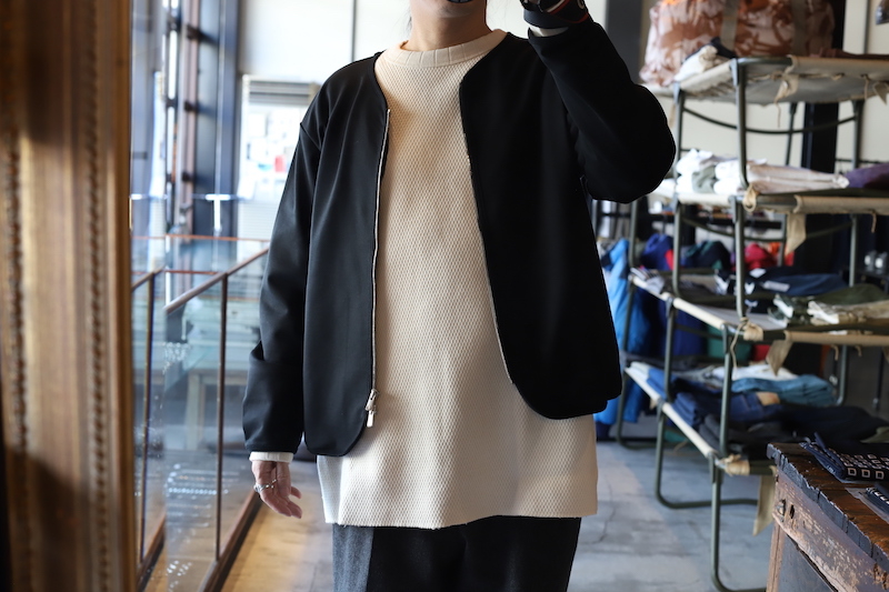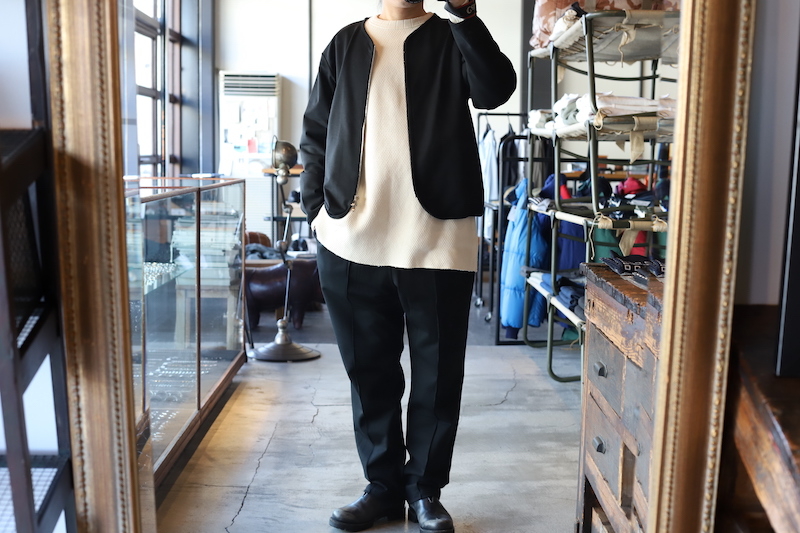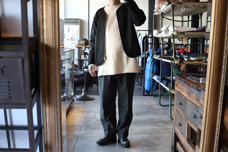 短丈で少し身幅にゆとりのあるボックスシルエット。スウェットにありがちなリブを使わずに、裾や袖口には細めのバインダー使用のおかげで上品に見える工夫。上下で合わせてもカジュアル過ぎない組み合わせです。