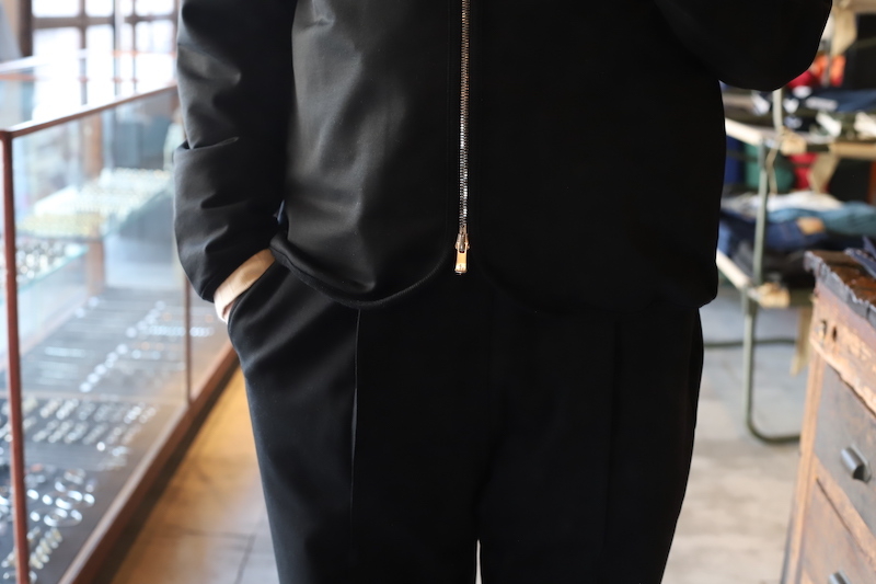 まず裏毛の細かさにびっくりします。スウェットパンツではあるんですが、細かな裏毛が綺麗に整列している様は高密度なのが目視出来ます。薄過ぎないで厚過ぎない生地で、素材はコットン100%にも関わらず表面には適度に光沢がある仕上がりです。