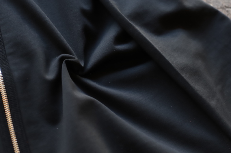 まず裏毛の細かさにびっくりします。スウェットではあるんですが、細かな裏毛が綺麗に整列している様は高密度なのが目視出来ます。薄過ぎないで厚過ぎない生地で、素材はコットン100%にも関わらず表面には適度に光沢がある仕上がりです。