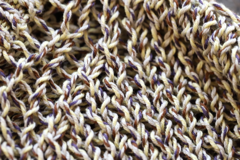 テープ状の糸ならではのランダムな色の出方で、単色にはない、やわらかくニュアンスのあるイエローベージュが魅力です。