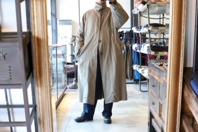 タテ糸に超長綿100/2、ヨコ糸に40/1のレーヨンを高密度に打ち込んだバーバリー素材を使用したバルマカーンコート。